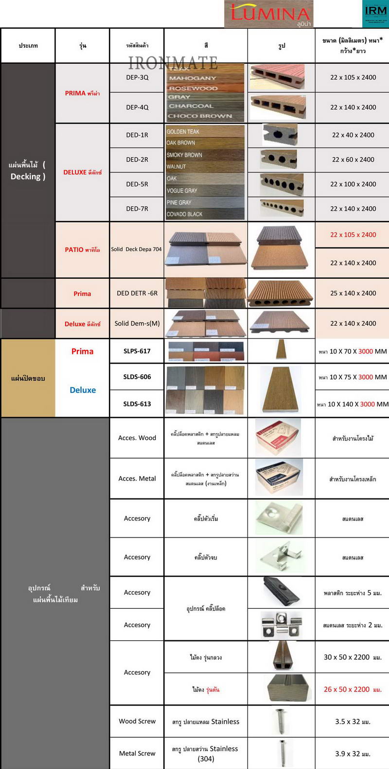 ทางร้านไอรอนเมท ได้ภูมิใจ นำเสนอขายส่งแผ่นพื้นไม้เทียมWPCและเป็นมิตรกับสิ่งแวดล้อม ด้วยข้อกำหนดการดูแลรักษาง่าย ทนทานกับสภาพอากาศและประสิทธิภาพการใช้งานที่ยาวนาน ของแผ่นพื้นไม้เทียม Lumina